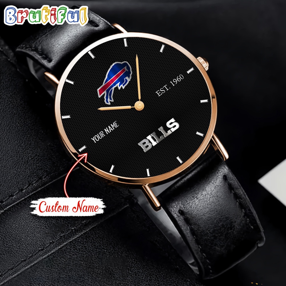 NFL Buffalo Bills Watch Custom Name Black Stitched Leather Watch