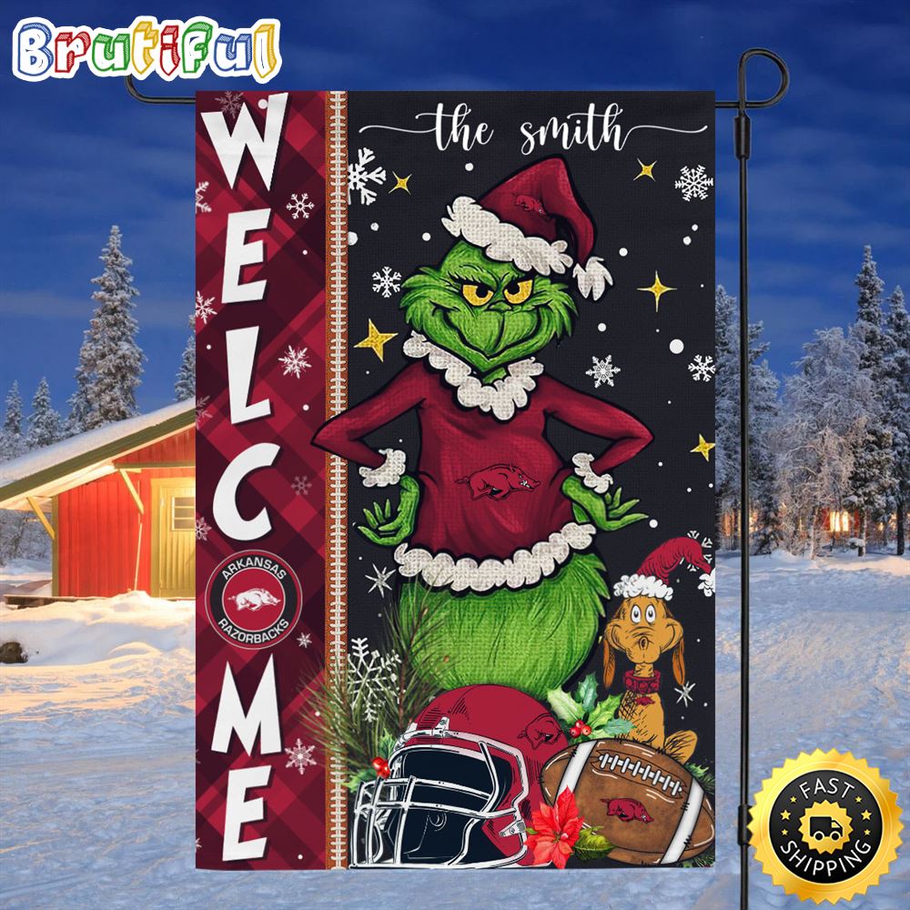 Customize NCAA Arkansas Razorbacks Garden Flag Grinch Football Christmas Welcome Garden Flag