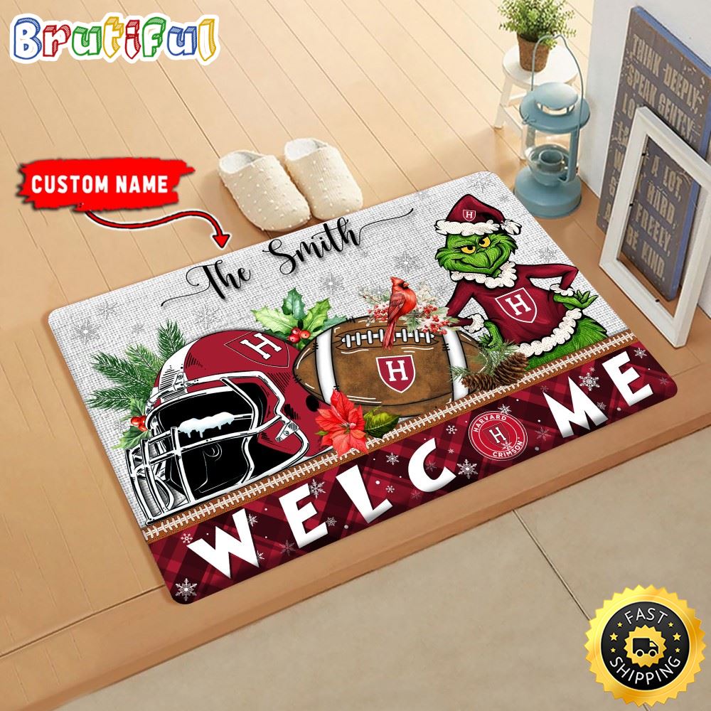 NCAA Harvard Crimson Doormat Grinch Christmas Welcome Custom Name Football Doormat