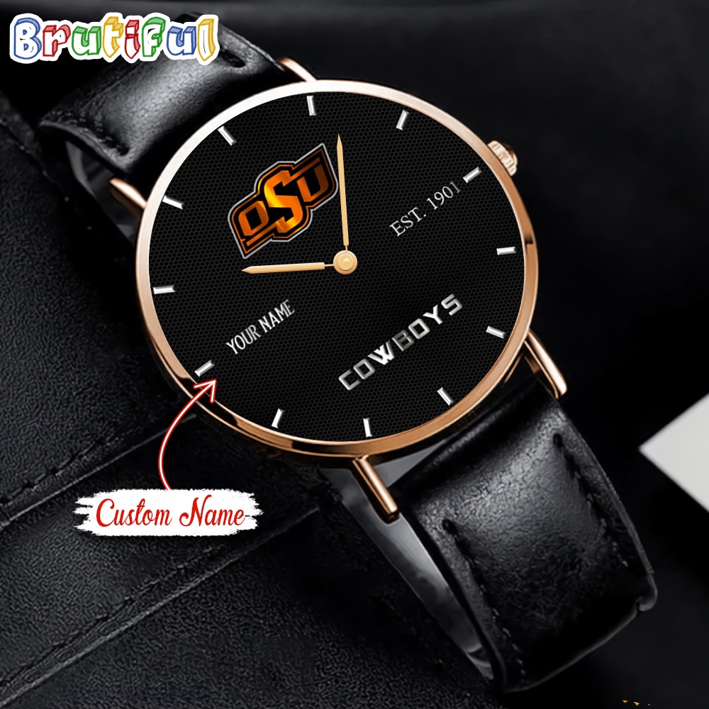 NCAA Oklahoma State Cowboys Custom Name Black Stitched Leather Watch